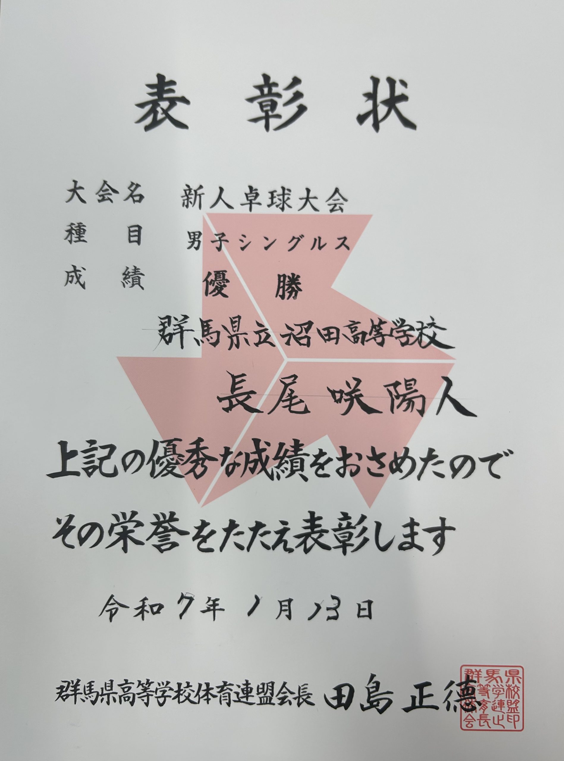 【卓球部】新人戦(個人の部)結果報告 2025 1/13 部活動 卓球 2025-01-13 1月11日(土)・13日(月)に行われた新人戦(個人の部)に参加しました。 〈男子シングルス> ・長尾咲陽人 優勝 ・綿貫晴斗 ベスト16 ・飯塚 蒼 ベスト16 <男子ダブルス> ・長尾咲陽人・飯塚蒼 ベスト8 部活動 卓球 しんしんと雪が舞う日には… #9 箏 特別授業 R7.1.16 関連記事 各部活動の新人大会の結果報告 更新しました 2026-01-30 【卓球部】全日本卓球選手権(ジュニアの部)結果報告 2026-01-28 【サッカー部】新人戦大会報告 2026-01-28 【卓球部】新人戦(個人の部) 男女シングルス 優勝!! 2026-01-14 【卓球部】 関東選抜 男子7位・女子6位 男女アベックで全国選抜! 2026-01-09 東京卓球選手権大会 群馬県予選 男子ダブルス優勝! 2025-12-16 【吹奏楽部】インクルーシブフェスタ 2025-12-09 男子バドミントン部 新人戦報告 2025-11-18