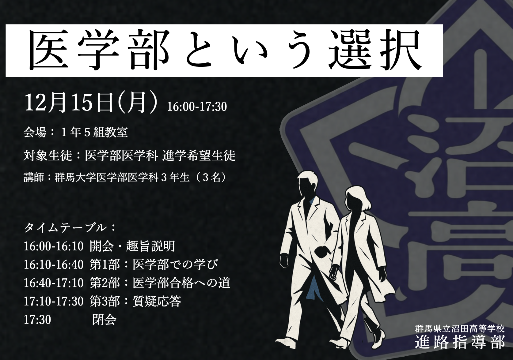 12月15日(月)に進路講演会「医学部という選択」を実施しました。