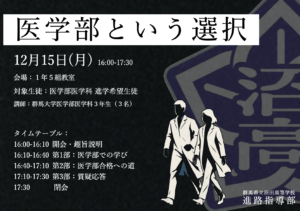 進路指導部からは、特に年内入試に向けては1・2年生のうちからの取り組みが重要であること、自身の経験や努力を「マイストーリー」として語れるようにすることの大切さが説明されました。また、県外の難関大学など高い目標を掲げ、日々の学習に励んでほしいというお話がありました。