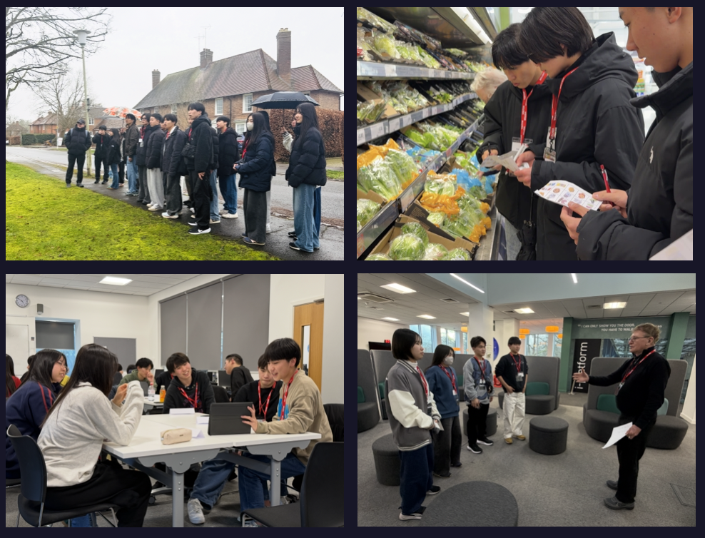 午後はキャンパス周辺でエリアオリエンテーションを実施しました。歩き始めてすぐに雨が降り出すという英国らしい天候の中、郵便局で日本宛ての絵葉書を投函し、スーパーマーケットでは配布されたイラストをもとに実物を探す活動に取り組みました。店内では英語でのやり取りにも挑戦し、実践的な学びの機会となりました。活動の終わり頃には雨も上がり、青空が広がりました。