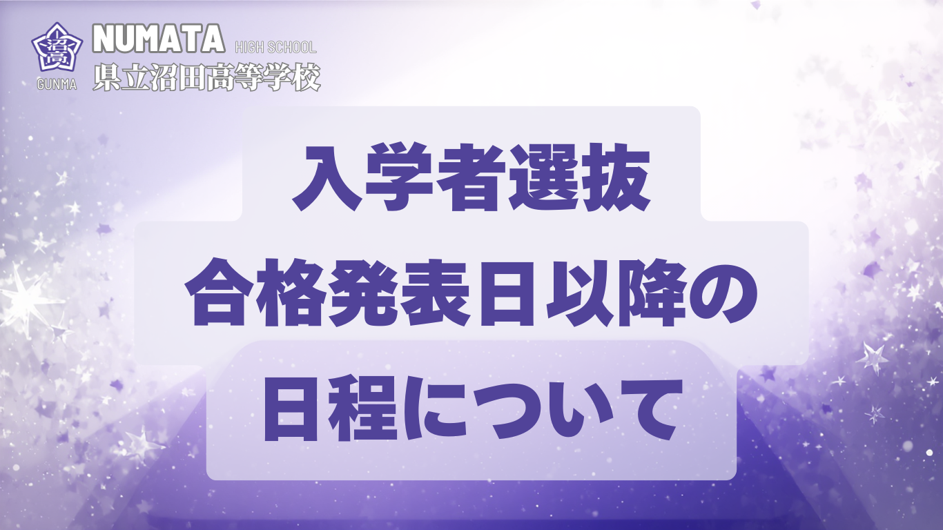 入学者選抜合格発表日以降の日程について 2026 2/25 受検生へ 2026-02-25 04_R6_3月5日入学者選抜合格発表以降の連絡ダウンロード 受検生へ イギリス研修 6日目報告 イギリス研修 7日目報告 関連記事 群馬県立沼田高等学校 令和8年度入学者選抜再募集における選抜方法等について(令和8年3月4日更新) 2026-03-04 令和8年度入学者選抜 受検生のみなさんへ (令和8年2月13日更新) 2026-02-13 令和8年度群馬県公立高等学校入学者選抜を受検する皆さんへ (令和8年1月19日 更新) 2026-01-19 沼田高校の選抜方法等について 2025-10-22 群馬県公立高等学校の入学者選抜に関する手続きについて 2025-10-03 9月13日(土)学校説明会 入試説明スライド4枚 2025-09-13 9/14(日) 部活動体験会 諸連絡③ 2025-09-12 9/13(土)学校説明会 諸連絡③ 2025-09-12